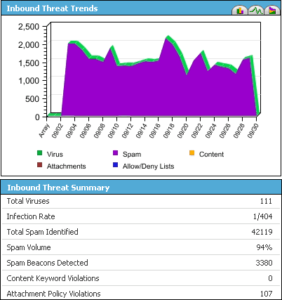 The Email Defense Service provides comprehensive, layered protection against a wide range of email-borne threats. This award-winning service blocks over 99% of spam, and provides effective zero-hour protection against viruses and worms.